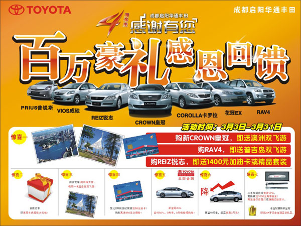 3月份周年庆时代,,,,,,,韦德网站官方入口华通丰田将推出“迎春、迎上宾”促销运动。。。。。。。。韦德网站官方入口华通丰田特意购置了大宗油卡,,,,,,,通常到店的客户,,,,,,,只要试驾恣意款车型,,,,,,,均可获赠88元油卡,,,,,,,每组客户限送一张,,,,,,,数目较多,,,,,,,送完即止。。。。。。。。周年庆时代所有购车的客户都将获赠交强险。。。。。。。。同时,,,,,,,在3月份所有来店的客户只要填写客户信息表,,,,,,,即可加入每周的抽奖,,,,,,,每周都会抽取一名幸运来店客户获得泰国普吉岛双飞游大礼。。。。。。。。周年庆时代,,,,,,,韦德网站官方入口华通丰田还会推出限量特价车,,,,,,,优惠幅度高达30000元。。。。。。。。